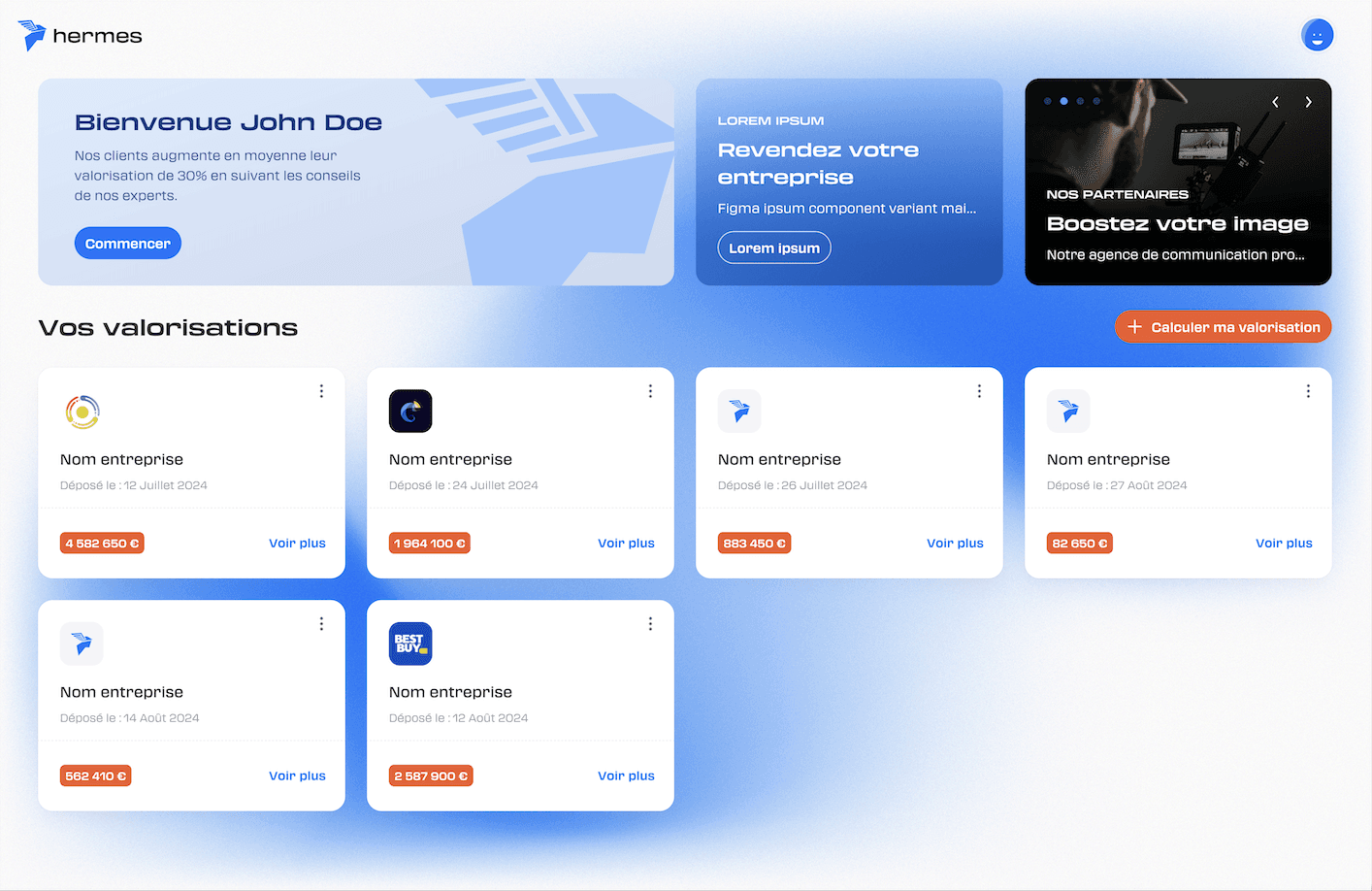 Le Challenge : Transformer la complexité financière en une expérience intuitive. L'estimation de la valeur d'une entreprise est souvent un processus long et opaque. Le défi avec Hermes était de créer une Web App capable de démystifier cette étape pour les entrepreneurs. L’objectif : un outil capable de délivrer une estimation précise en quelques minutes, en s’appuyant sur un algorithme intelligent mais une interface volontairement simplifiée.